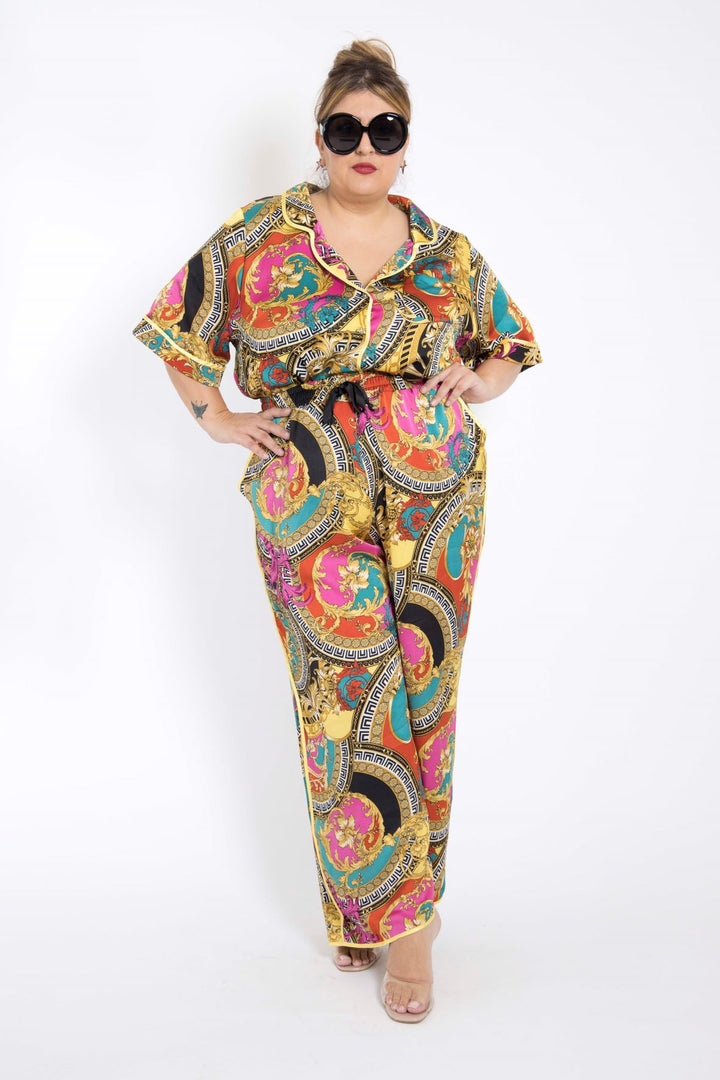 This is how I love to dress. This look is formal enough for you to shut it down at dinner, the office, wherever you find yourself outside and cozy enough to welcome friends over. Made from the highest quality poly charmeuse. Fabric is very show to wrinkle and we know that's important to you. Drawstring pants with working pockets and elastic waist. Shirt has a single pocket. We cut the pants a little longer than usual in case you'd like to pair the look with platforms or the wedge of your choice for summer. Or arrange with us for our internal tailoring salon to hem.