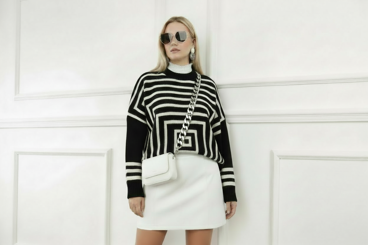 This black and white graphic sweater is your new wardrobe go-to when you want comfort with edge. Made from 100% cotton, it’s soft, breathable, and ideal for layering through all seasons.