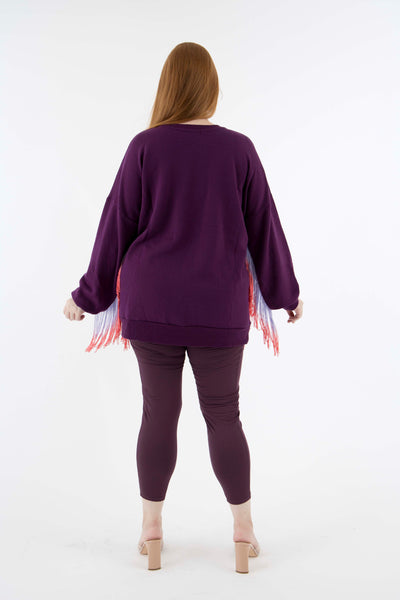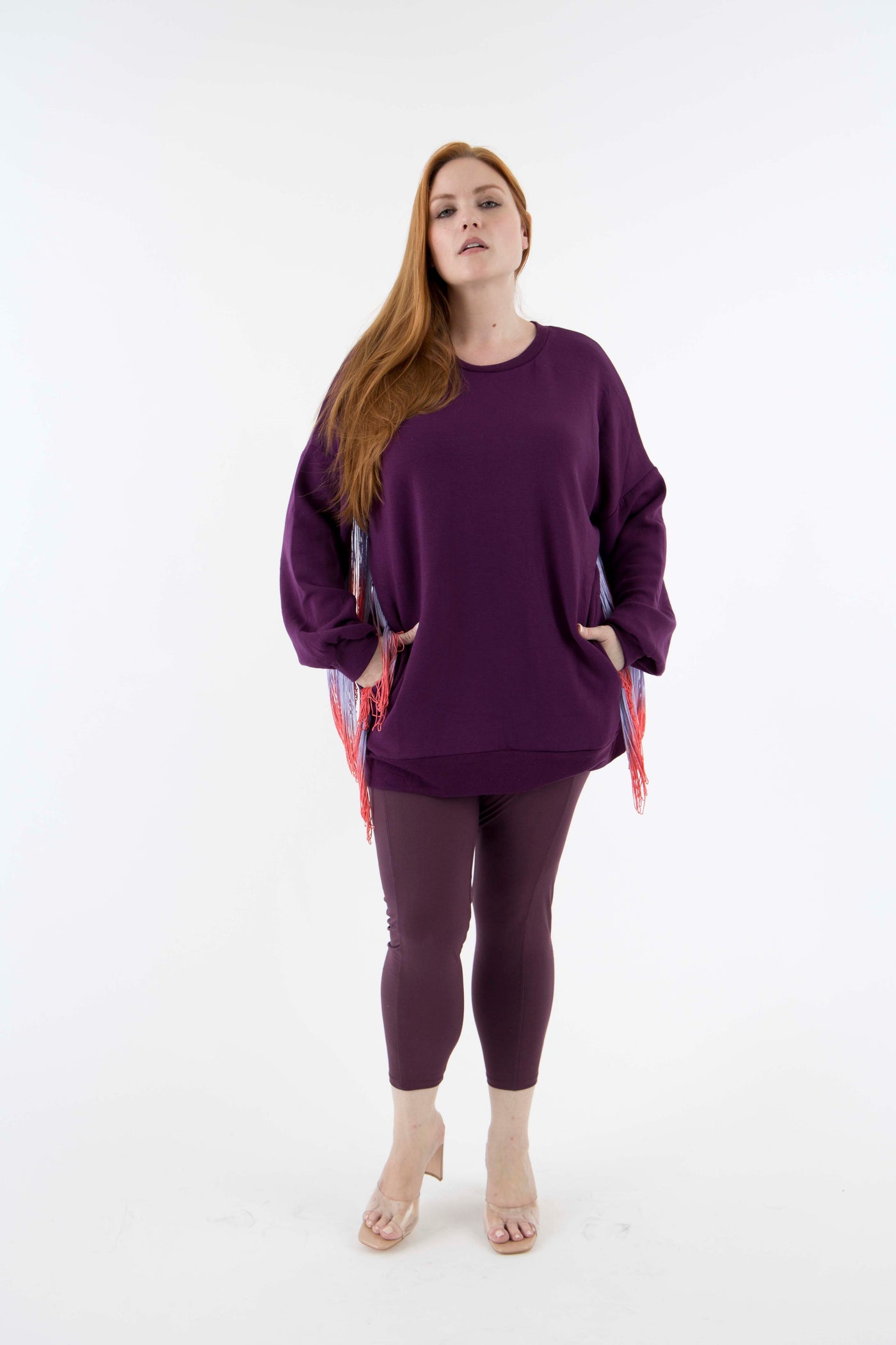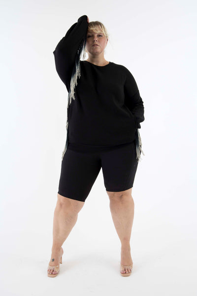 Jewel neck sweatshirt made from cotton/lycra. SURPRISE the sweat shirt has pockets and fringe!!!!! Hand wash or dry clean. We're pairing this item with everything in our collection; faux leather pants, denim, biker shorts, leggings.....